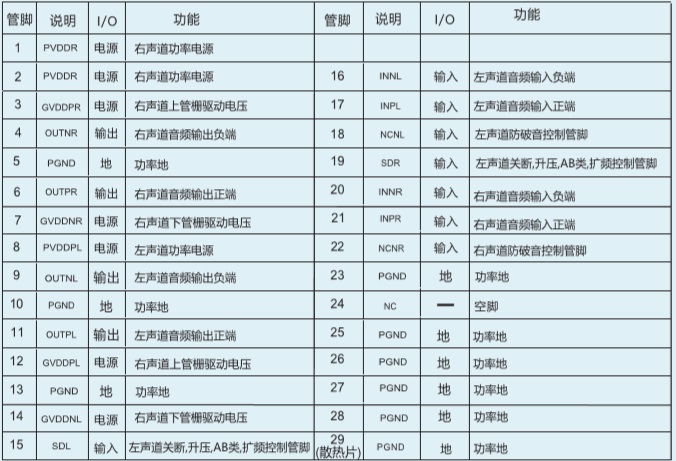 RL = 8 Ω 峰值功率2x15W(AB MODE)