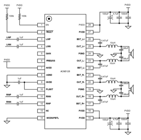 ACM3128(動態(tài)調(diào)整升壓CLASS H功能、40W立體聲/80W單聲道D類音頻功放IC) |
