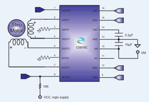 CS9016C為玩具、打印機(jī)和其它電機(jī)一體化應(yīng)用提供一種雙通道電機(jī)驅(qū)動方案。CS9016C有兩路H橋驅(qū)動,可以驅(qū)動兩路刷式直流電機(jī),一個雙極步進(jìn)電機(jī),多個螺線管或者其它感性負(fù)載。每個H橋的功率輸出模塊由N溝道功率MOSFET組成,用于驅(qū)動電機(jī)繞組。每個H 橋均具備調(diào)節(jié)或限制繞組電流的電路。該器件利用故障輸出引腳實現(xiàn)內(nèi)部關(guān)斷功能,提供過流保護(hù)、短路保護(hù)、欠壓鎖定和過熱保護(hù),并提供了一種低功耗休眠模式。另外提供一個錯 誤輸出管腳nFAULT,當(dāng)過流過溫保護(hù)的時候,nFAULT為低電平.