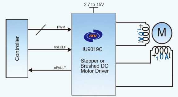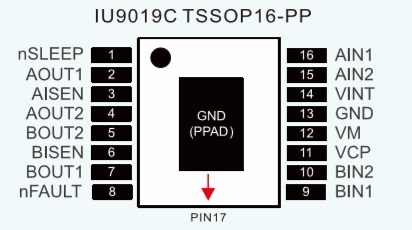 IU9019C為玩具、打印機和其它電機一體化應用提供一種雙通道電機驅動方案。IU9019C有兩路H橋驅動,可以驅動兩路刷式直流電機,一個雙極步進電機,多個螺線管或者其它感性負載。每個H橋的功率輸出模塊由N溝道功率MOSFET組成,用于驅動電機繞組。每個H 橋均具備調節(jié)或限制繞組電流的電路。該器件利用故障輸出引腳實現(xiàn)內部關斷功能,提供過流保護、短路保護、欠壓鎖定和過熱保護,并提供了一種低功耗休眠模式。另外提供一個錯 誤輸出管腳nFAULT,當過流過溫保護的時候,nFAULT為低電平.