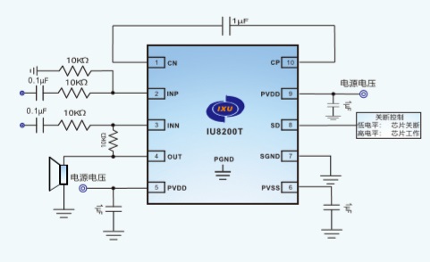 IU8200T是一款支持差分輸入,支持大動態(tài)輸入信號300mW單聲道高性能音頻驅動芯片,專為電路板空間有限的便攜設備而設計。IU8200T采用單端模式輸出,其直驅模式結構單電源供電時能夠產生以地為參考的輸 出,從而省去了大尺寸的隔直電容,既節(jié)省了成本和電路板空間,也降低了元件的高度。IU8200T可向16Ω負載提供高達300mW輸出功率, THD+N僅為0.006%。217Hz時具有86dB的高電源抑制比(允許該器件工作在嘈雜的數字電源,無需額外的線性穩(wěn)壓器件)。精巧的咔嗒聲抑制電路消除了啟動與關斷過程中的可聞噪聲。低功耗關斷控制, 可以在混聽模式有效的節(jié)省能源。IU8200T工作電壓范圍在2.5V-5.5V,待機時僅消耗3.2mA電源電流,具有短路保護與熱過載保護。IU8200T封裝形式為DFN2X2_10L,其額定的工作溫度范圍為-40℃至85℃。