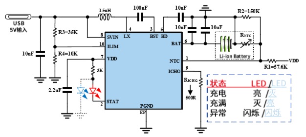 ■ LED指示燈使用時(shí)需接限流電阻到VDD,推薦3K。如需使用雙燈方案,必須按照?qǐng)D中LED燈顏色配置,請(qǐng)購(gòu)買(mǎi)對(duì)應(yīng)顏色LED燈進(jìn)行實(shí)驗(yàn),充 電時(shí)紅燈亮,藍(lán)燈滅;充滿(mǎn)時(shí)藍(lán)燈亮,紅燈滅;異常時(shí)紅燈藍(lán)燈交替閃爍。
