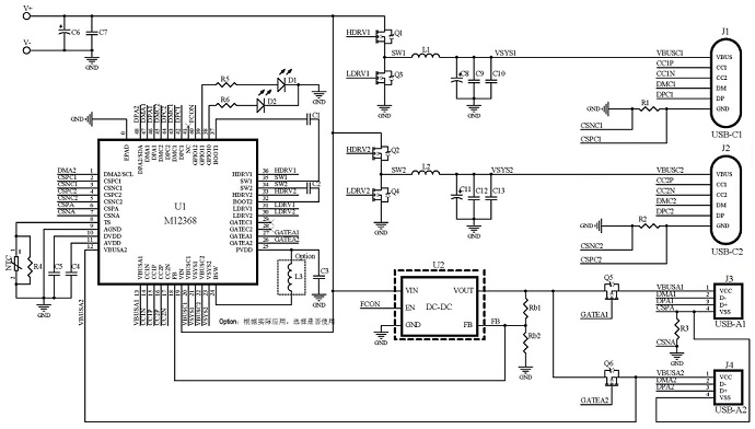 M12369 是一款面向大功率快充應(yīng)用的電源管理 SOC,集成了微處理器、雙路降壓變換器、快充協(xié)議控制 器,支持 PD3.1、QC3.0、SCP、FCP、AFC、BC1.2 DCP 等全部主流快充協(xié)議,結(jié)合少量元件即可組成雙C 口的 140W大功率快充解決方案;輔以 DC-DC 芯片,還可擴(kuò)展為3路獨(dú)立的C+C+AA多口大功率快充解決方案。