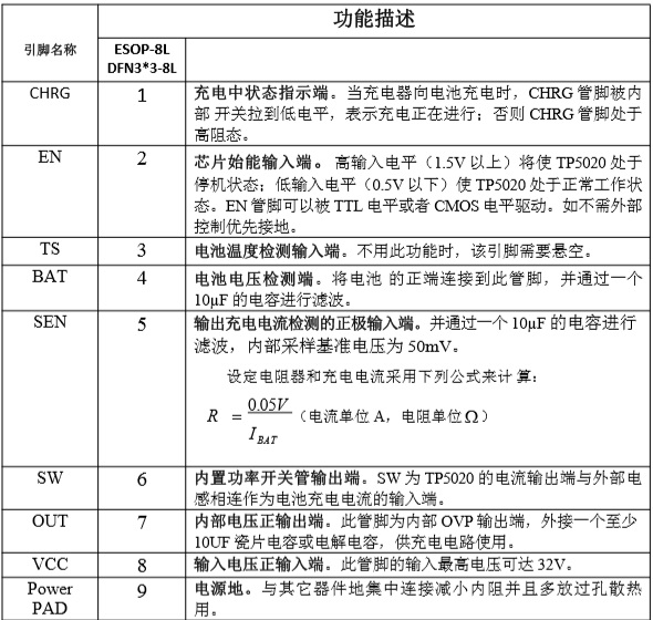 TP5020是一款輸入電源32V高耐壓具備OVP保護功能完整的降壓同步開關型單節(jié)鋰電池充電管理芯片。其ESOP-8L/DFN3*3-8L的封裝與簡單的外圍電路,使得TP5020非常適用于便攜式設備的大電流充電管理應用。同時TP5020內置、輸入欠壓保護、輸入過壓保護、芯片過溫保護、充電電池溫度檢測、BAT端短路保護、充電安全定時時間、EN 使能端等功能。 TP5020具有寬輸入電壓,對電池充電分為0V充電電流、涓流預充、恒流、恒壓階段, 恒流充電電流都通過外部電阻調整,最大充電電流達2.5A。TP5020采用頻率1.5MHz的開關工作模式使它可以使用較小的外圍器件,并在大電流充電中仍保持較小的發(fā)熱量。TP5020內置降壓功率MOSFET、防倒灌電路,所以無需防倒灌肖特基二極管等外圍保護。