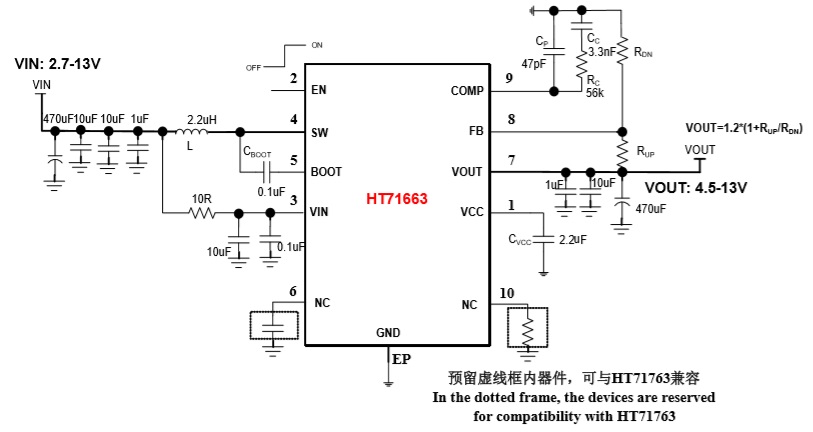 HT71663具有2.7V至13V寬輸入電壓范圍,可為采用單節(jié)或兩節(jié)鋰電池的應(yīng)用提供支持。該器件具備10A開關(guān)電流能力,并且能夠提供最高13V的輸出電壓。