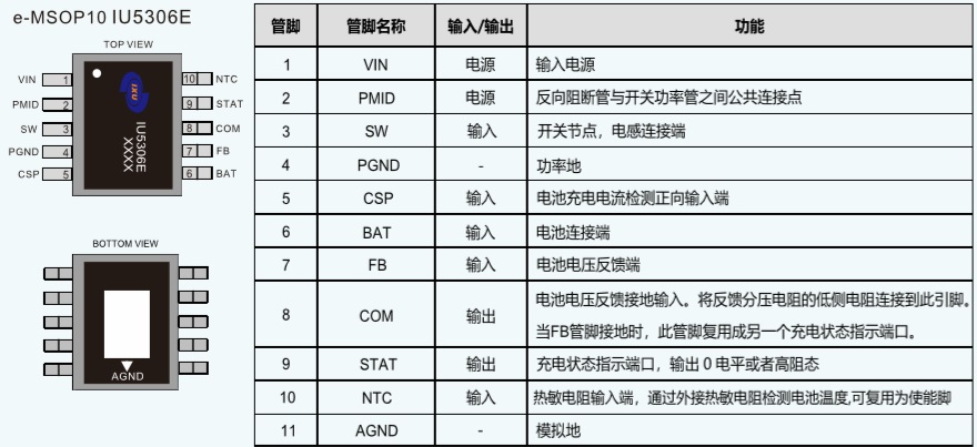 IU5306E是一款5V輸入,支持單節(jié)鋰電池或鋰離子聚合物電池的降壓充電管理IC。IU5306E集成功率MOS,采用同步開關(guān)架構(gòu), 使其在應(yīng)用時僅需極少的外圍器件,可有效減少整體方案尺寸, 降低BOM成本。IU5306E轉(zhuǎn)換器具有2.5A的充電電流能力, 充電電流可以通過外部電阻靈活可調(diào)。