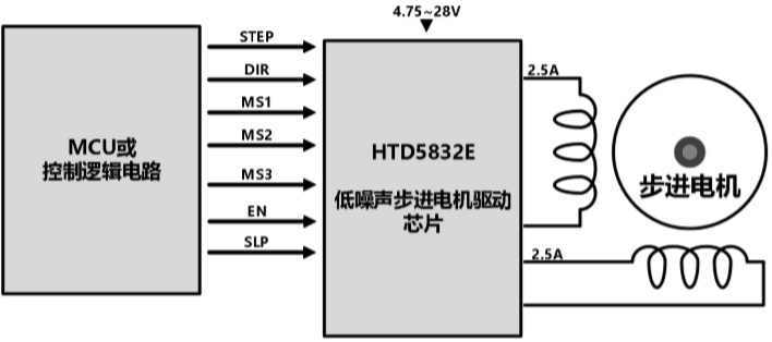 HTD5832E可使電機(jī)工作時(shí)噪聲降低,即使是以整步運(yùn)行,也能達(dá)到平滑的轉(zhuǎn)動(dòng)效果。