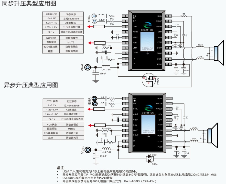 CS83812C是一款適用于1-2節(jié)鋰電池應用,帶防破音,AB/D切換,升壓模塊同步異步可選,并且升壓模塊具備自適應升壓功能的R類單聲道音頻功率放大器。