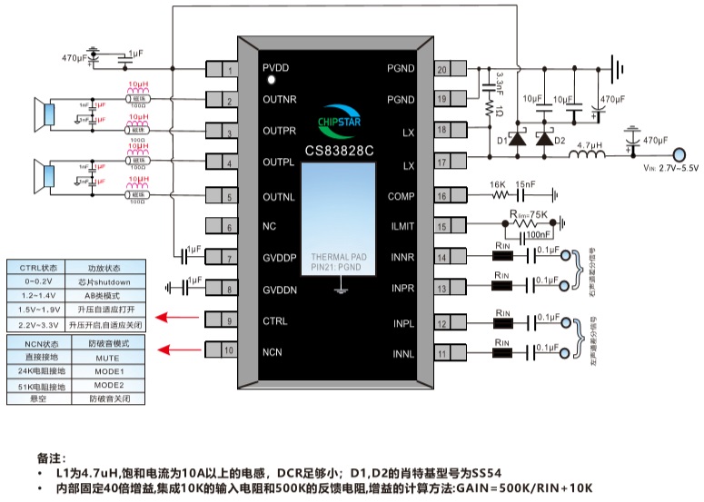 CS83828C是一款適用于單節(jié)鋰電池應(yīng)用,固定增益,帶兩種防破音,AB/D切換,靜音功能,內(nèi)置BOOST升壓模塊的R類立體聲音頻功率放大器。