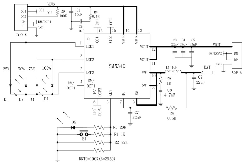 SM5340采用開關(guān)充電技術(shù),提供最大2.4A充電電流,充電效率高至92%。通過內(nèi)置芯片溫度檢測和輸入電壓智能調(diào)節(jié)充電電流。