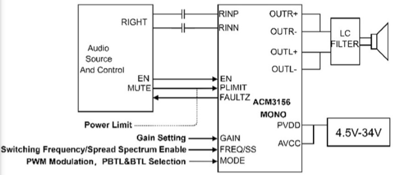 ACM3156工作電壓范圍在 4.5-34V,輸出配置可以立體聲BTL,也可以單通道PBTL。